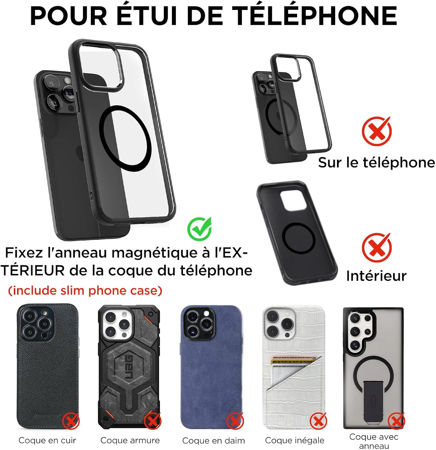 Pour les coques épaisses, l’anneau magnétique fourni permet d’améliorer l’adhérence.